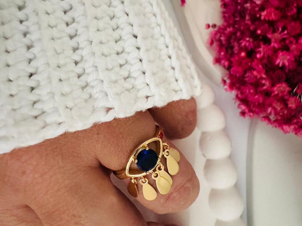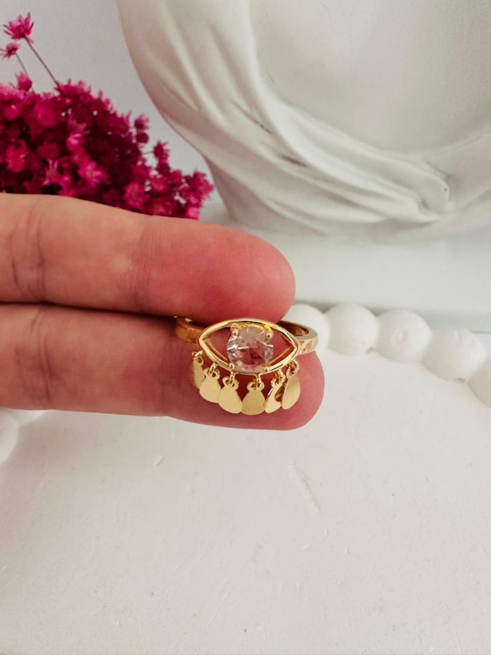 - Design Exclusivo: Com seu formato de olho grego e pingentes delicados, este anel é uma peça única que se destaca em qualquer ocasião.
