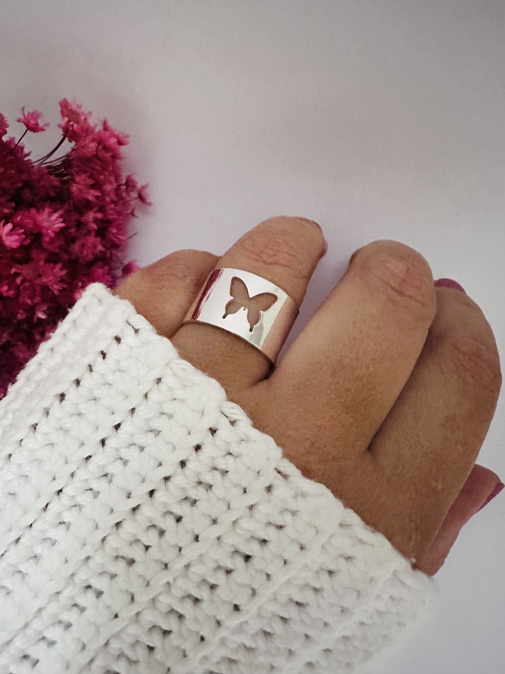 O design vazado em forma de borboleta traz um toque especial, simbolizando liberdade e transformação. Este anel é ideal para adicionar um charme extra ao seu visual, seja em eventos especiais ou no dia a dia.