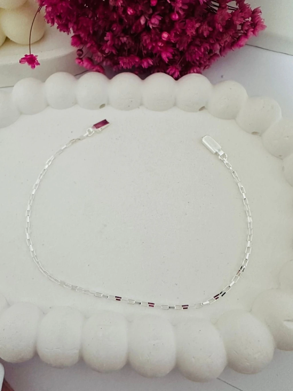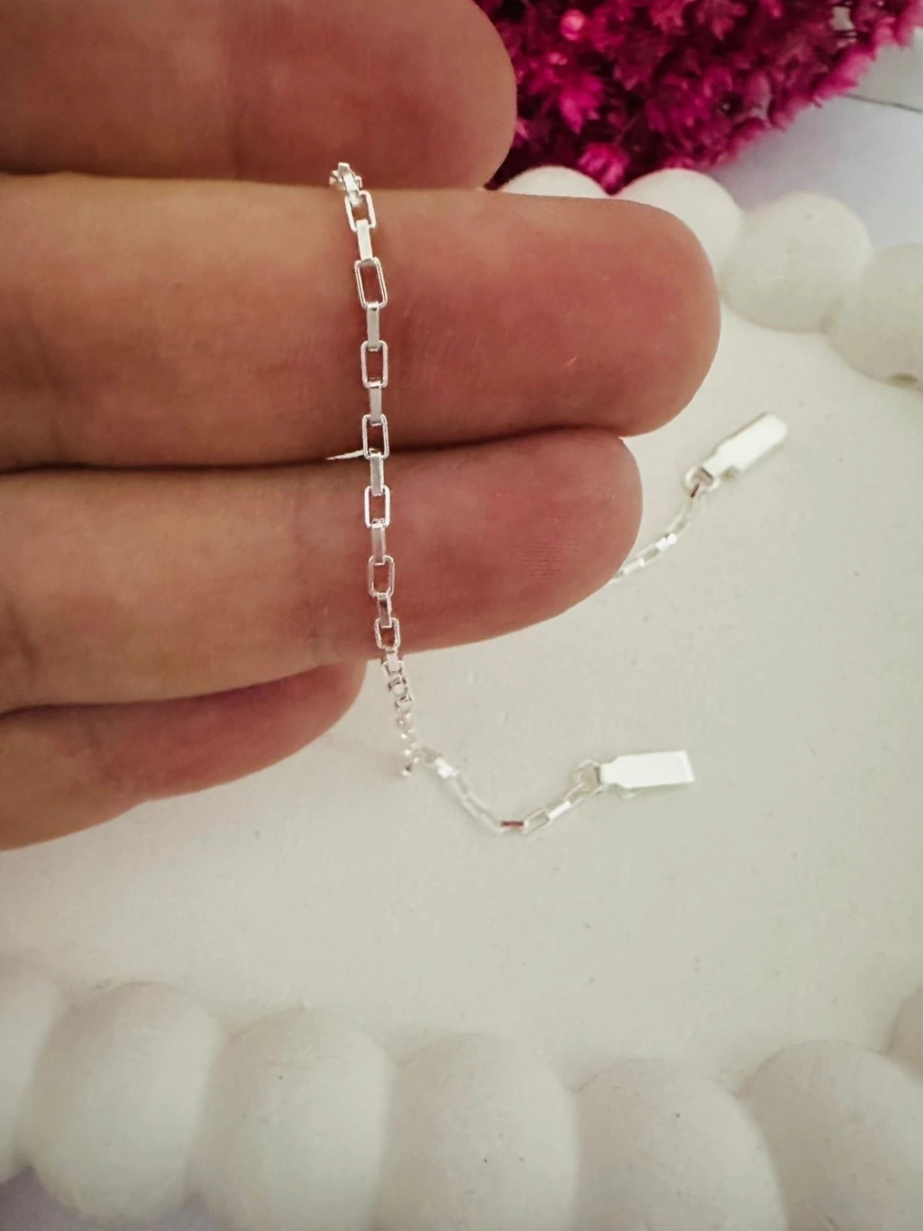 Cuidados para manter sua pulseira sempre nova: - Evite contato com água, como piscina, mar e banho, para preservar o banho de prata; - Afaste a pulseira de perfumes, cremes e produtos químicos; - Limpe regularmente com pano macio e seco; - Retire-a antes de atividades físicas para evitar o contato com o suor.